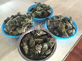 大家一开始都笨手笨脚,不是米放多了,就是把粽叶弄裂了....在包粽子过程中,随着相互交流,每个人的技术都越来越熟练,折粽叶、填糯米、加红枣…一道道工序有条不紊地进行着,正方形、三角形、五角形、长条形……各式各样的粽子在他们手中诞生。看着包好的粽子形态各异,大家忍俊不禁,开怀大笑。