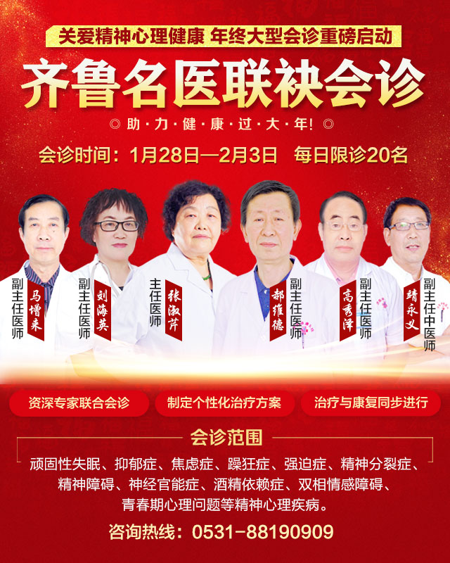 在春节来临之际,为了帮助更多的失眠、抑郁症、焦虑症、躁狂症、精神分裂症、酒精依赖症、心理障碍等疾病患者能和家人一起过上一个健康祥和年,应广大患者强烈要求,1月28—2月3日,济南神康医院特别推出齐鲁名医年终大型会诊,原山东省精神卫生中心专家、济南神康医院张淑芹院长,原山东省精神卫生中心专家、“SK医康一体”治疗与康复体系学科带头人郝维德主任领衔,众多齐鲁精神科名医坐镇,为疑难精神疾病患者提供高质量、高水平、规范化的诊疗方案。